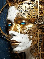 Een fascinerend portret van een futuristische figuur wiens gezicht half bedekt is door een gouden, mechanisch masker versierd met tandwielen en ingewikkelde decoraties. Haar ogen glanzen in een intens blauwe kleur en vormen een schril contrast met het metallic goud en de bleke huid. Gouden accenten lopen over haar lippen en lijken te smelten als vloeibaar metaal. De achtergrond is diepblauw, versierd met gouden, cirkelvormige patronen en andere mechanische elementen. De scène combineert op surrealistische wijze organische schoonheid met complexe technologie.