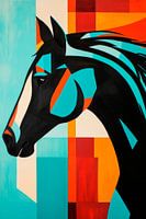 Een krachtig paardenprofiel, omringd door levendige kleurencombinaties van blauw, oranje en rood, trekt onmiddellijk de aandacht. De dynamische vormen en het opvallende contrast creëren een energieke sfeer. Ideaal voor de woonkamer, brengt leven en expressiviteit in elke kamer en inspireert tot gesprekken.