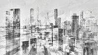 Deze zwart-wit illustratie toont een dicht, futuristisch stadslandschap gedomineerd door torenhoge wolkenkrabbers. De indrukwekkende architectuur bestaat uit een mix van strakke, moderne gebouwen en complexe structuren die de evolutie en vooruitgang van de stedelijke architectuur weerspiegelen. De wolkenkrabbers reiken tot in de hemel en creëren een gevoel van grandeur en kracht. De dichte plaatsing van de gebouwen en de smalle straatravijnen geven de indruk van een pulserende metropool die voortdurend in beweging is. Lichtreflecties en schaduwen versterken de diepte en de rijkdom aan details in de illustratie, waardoor een fascinerend tafereel ontstaat dat zowel organisch als technologisch lijkt. De afwezigheid van kleur benadrukt de structuren en vormen, terwijl het monochrome palet een tijdloze maar futuristische sfeer creëert. Deze voorstelling is ideaal voor het visualiseren van thema's als verstedelijking, technologische innovatie en de toekomst van het stadsleven. Het spreekt zowel architectuur- en designliefhebbers als fans van sciencefiction en toekomstvisies aan.