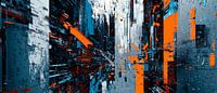 Een dynamische, abstracte wereld ontvouwt zich in levendige tinten blauw en fel oranje, die doen denken aan futuristische stadsgezichten. De overlappende structuren geven een gevoel van beweging en energie, perfect voor een moderne woonkamer of een creatief kantoor. Dit is waar kunst technologie ontmoet en iedereen die de kamer binnenkomt inspireert.