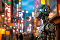 In een stedelijk landschap, verlicht door kleurrijke neonlichten, staat een futuristische robotfiguur wiens glanzende oppervlak het pulserende stadsleven weerspiegelt. De glanzende ogen lijken een verhaal te vertellen dat technologie en menselijkheid combineert. Deze afbeelding brengt een vleugje sciencefiction in de woonkamer en…