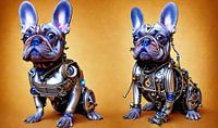 De afbeelding toont futuristische Franse bulldogs gekleed in glanzende cyborg-pakken en robotische lichaamspantsers. Deze ongewone combinatie van huisdier en technologie creëert een uniek en fascinerend tafereel.