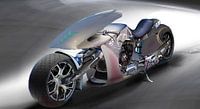 Supersnelle racemotor, ook wel moter. Dit racemonster komt uit de verbeelding van de kunstenaar die hier een benzine slurpende motorfiets met brede banden en stroomlijn neerzet.