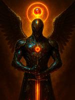 Dit indrukwekkende digitale kunstwerk met prachtige details toont een futuristische aartsengel in een donker, slaghard, gloeiend harnas dat kracht en mystiek uitstraalt.