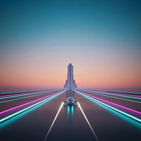 Een futuristische scène met een auto op een weg die naar een gebouw leidt, geaccentueerd door neonlichten, tegen een zonsondergang met kleurverloop.