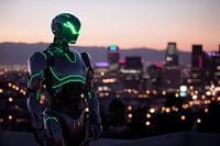 Een futuristische figuur rijst op te midden van een stedelijke achtergrond, waarbij de gloeiende groene accenten en metallic textuur onmiddellijk in het oog springen. Deze indrukwekkende weergave van technologie en menselijkheid trekt de aandacht van de kijker en is perfect voor een moderne woonkamer om gesprekken op gang te brengen…