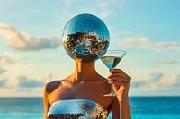 Een fascinerend spel van licht en reflecties ontvouwt zich hier, met een sprankelende spiegelkop die het zonnige paradijs vastlegt. Het glamoureuze silhouet en de elegante cocktail geven de kamer een artistiek tintje. Ideaal voor de woonkamer of een trendy barhoek waar creativiteit en stijl centraal staan.