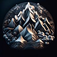 Dit schilderij toont een artistieke interpretatie van alpiene bergtoppen in een cirkelvormig kader dat harmonie en evenwicht benadrukt. De bergen zijn gemodelleerd met een mix van vloeiende lijnen en scherpe, hoekige richels, waardoor een surrealistische en elegante weergave van de natuur ontstaat. Tinten blauw, wit en gedempt goud geven de compositie een hemelse en dromerige kwaliteit en suggereren een verbinding tussen aarde en lucht.