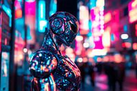 Midden in een levendig stedelijk landschap schittert een futuristische figuur in glinsterend chroom, omringd door gloeiende neonlichten. Deze mix van mens en machine belichaamt innovatie en creativiteit. Ideaal voor een moderne woonkamer, transformeert het de kamer in een plek vol inspiratie en futuristische energie.