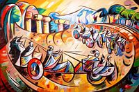Dit levendige ontwerp is een dynamisch kunstwerk dat de energie en snelheid van een futuristische race vastlegt. Met een kleurrijk palet van levendige tinten zoals oranje, geel, blauw, rood en groen, lijkt het schilderij bijna te bewegen. De abstracte vormen van de racekarren en paarden geven het werk een speelse, energieke uitstraling…