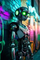 De elegante robot schittert in futuristische, levendige kleuren met zijn felgroene ogen en glanzende metalen oppervlakken. De stedelijke graffiti creëert een spannende achtergrond die creativiteit en innovatie belooft. Perfect voor een moderne woonkamer of een inspirerend kantoor, dit kunstwerk brengt een vleugje sciencefiction in het…