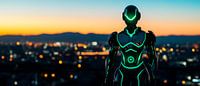 Te midden van een futuristische skyline schittert een lichtgevende, mensachtige figuur in glinsterend groen en blauw, waarbij zijn technologische uiterlijk de grenzen tussen mens en machine doet vervagen. De dramatische zonsondergang op de achtergrond draagt bij aan de mystieke sfeer. Ideaal voor een moderne woonkamer of een kantoor…