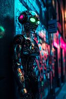 In een stedelijke droomwereld schittert een futuristische robot met levendige, gloeiende ogen in groen en rood. Zijn glanzende metaal weerspiegelt de levendige kleuren van de graffitimuren en voegt een vleugje sciencefiction toe aan elke kamer. Perfect voor een moderne woonkamer die een vleugje technologie en creativiteit wil uitstralen.