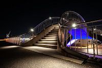 Voetgangersbrug met verlichting in verschillende kleuren. Onder architectuur gebouwde openbare werken langs een treinrails met organische en ronde vormen. Zee verdedigingswerken lans een boulevard in Harlingen voor hoog water bescherming van de wadden zee. Roestvrij stalen hekwerk langs wandelpad met led verlichting en uitzicht over de haven en de vesting stad in Holland
