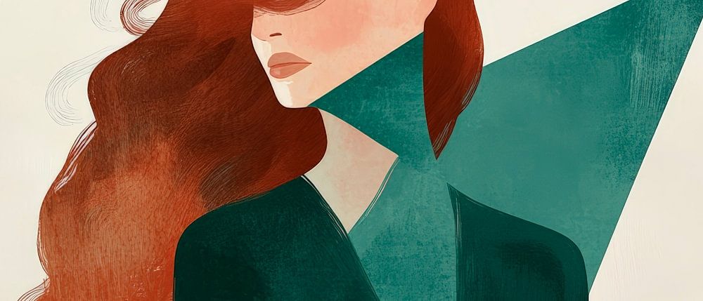 Een mysterieus portret dat fascineert met zijn vloeiende lijnen en zachte kleuren. De fascinerende rode kleur van het haar en de geometrische vormen op de achtergrond creëren een harmonieuze balans tussen elegantie en moderniteit. Ideaal voor een stijlvolle woonkamer die creatieve expressie en een ontspannen sfeer combineert.