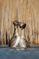 Fuut (Podiceps cristatus) die verkering uitvoert, huwelijksdans, pinguïndans, pinguïndans, rechtopstaand in het water, dieren in het wild, Europa.