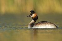 Fuut (Podiceps cristatus) in natuurlijke omgeving, warme kleuren, laat licht, mooie foto lay-out, bekend motief, wild, Europa.