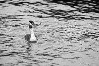 Een foto gemaakt van een fuut in het water tijdens een storm. Je ziet mooi de golven van het water wat in het zwart wit ook bijna op zand lijkt. De foto heb ik gemaakt in de haven van Leerdam