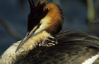 De fuut met jong op de rug. Deze watervogel heeft een prachtig mooie kuif. Ze hebben een spectaculaire balts rituelen in het voorjaar. De jongen zitten de eerste dagen, wanneer ze uit het ei gekomen zijn, op de rug van de ouders. Ze worden dan gevoerd met kleine visjes en grote insecten.