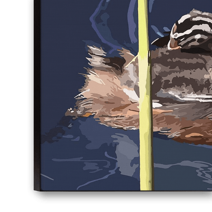 Het digitale kunstwerk “Fuut met jongen” toont een ontroerend tafereel van een moederfuut die sierlijk door het water glijdt, haar twee jongen veilig en beschut op haar rug. De fuut, met haar kenmerkende slanke hals, sierlijke kopveren en contrastrijke kleuren van bruin, zwart en wit, vormt het levendige middelpunt van het beeld. De jongen, nog donzig en gestreept in grijstinten, kruipen dicht tegen haar aan, een symbool van zorg en geborgenheid.
