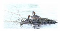 De mannetjes fuut biedt een visje aan zijn vrouwtje op het nest aan.