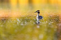Een grote fuut omcirkelt een vijver. Het riet schijnt in het zonlicht en wordt gereflecteerd in het water.