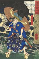 Fuwa Bansaku in blauwe kleding en op hoge geta, opkijkend naar een op zijn paraplu zittend groot zwart monster.