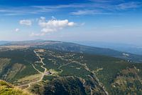 Uitzicht vanaf de top van de Schneekoppe naar het noordwesten. Het Reuzengebergte is het hoogste gebergte van Silezië. De Schneekoppe is 1603 meter boven de zeespiegel, ligt boven de boomgrens en is de hoogst gelegen plaats. Het is ook de hoogste berg in het Sudetengebergte, de Midden-Europese drempel van het middelgebergte en Tsjechië. De staatsgrens tussen Polen en Tsjechië loopt over de top. De Silezische mijnwerkersloge, Schronisko Dom ?l?ski, is te zien in de verte.