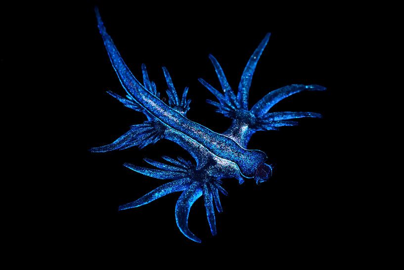 Een betoverend portret van de Glaucus atlanticus, ook wel bekend als de Blue Dragon. Dit zeldzame zeeslakje lijkt haast buitenaards met zijn iriserende blauwtinten en symmetrische, vleugelachtige vormen. Tegen de diepe zwarte achtergrond komt het organisme krachtig naar voren, waardoor elk detail en elke glinstering zichtbaar…