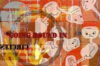 Een collage van Marijke Mulder. Eenvoudige karakters. Emoties in enkele lijnen. Een schets, een foto van een stuk verweerd hout. Geschilderde vierkantjes. In rondjes draaien tot je sterretjes voor je ogen ziet. Er niet uitkomen. Komisch zonder drama. Komt allemaal weer goed. Kleuren oranje rood geel antraciet bordeaurood zwart. Ik combineer alles in een collage: foto's, tekeningen, schetsen, schilderijen, stukken aquarel, ruitjespapier, knipsels van naaipatronen, krantenknipsels, stukjes Franse tekst uit de bladen, enz. De collage maak ik al spittend door mijn door de jaren heen opgebouwde archief. De collage komt tot stand in fasen. Op de schildersezel, op de tekentafel, gefotografeerd en opnieuw in delen gesplitst. Herhaling van handelingen, het wegen van het resultaat, afstand nemen en een paar dagen niets ermee doen en dan doorwerken omdat het beeld zich ineens vormt en het werk als vanzelf onder je handen vandaan komt.