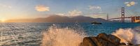 De baai van San Francisco bij Baker Beach met uitzicht op Sausalito op de Golden Gate Bridge, het beroemde herkenningspunt van San Francisco tijdens de zonsondergang.