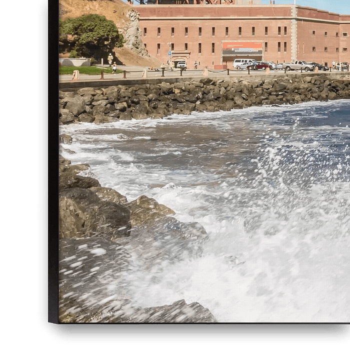 De baai van San Francisco bij Fort Point met uitzicht op de Golden Gate Bridge, het beroemde herkenningspunt van San Francisco. De brug werd voltooid in 1937. Klassiek uitzicht vanaf de kust met een sterke branding.