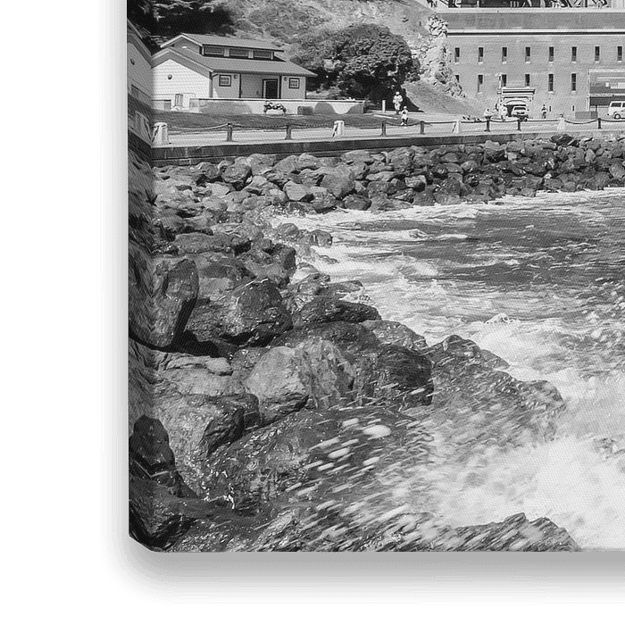 De baai van San Francisco bij Fort Point met uitzicht op de Golden Gate Bridge, het beroemde herkenningspunt van San Francisco. De brug werd voltooid in 1937. Klassiek zwart-wit uitzicht vanaf de kust met een sterke branding
