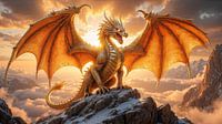 Boven de wolken rijst GOLDRAKON op, de gouden draak op de bergtop. Zijn glanzende schubben weerspiegelen het zonlicht als vloeibaar vuur, terwijl zijn enorme vleugels de hemel beheersen. Met vlammende ogen waakt hij over het rijk van de toppen en de eindeloze oceaan van wolken.