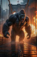 Vuur en rook hullen de skyline in chaos wanneer GORVAN, de kolossale gorilla, brullend over de Brooklyn Bridge stormt. Zijn massieve lichaam trilt van pure kracht, zijn vuisten beuken op het staal, terwijl explosies de hemel in vlammen zetten. Elke stap is een aardbeving, elke brul een storm van woede.