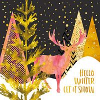 Moderne grafische kunst in een elegante Gouden Outfit en typografische elementen. Liefdevolle winter landschap met Tekst: Hallo winter laat de sneeuw.