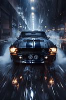 Een zwarte Mustang rijdt door een regenachtige stadstraat