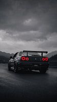 Het iconische achteraanzicht van een Nissan Skyline GT-R (R34), direct herkenbaar aan de klassieke dubbele ronde rode achterlichten. De stemmige, bewolkte bergweg draagt bij aan de felle aanwezigheid van de legendarische Japanse sportwagen's.