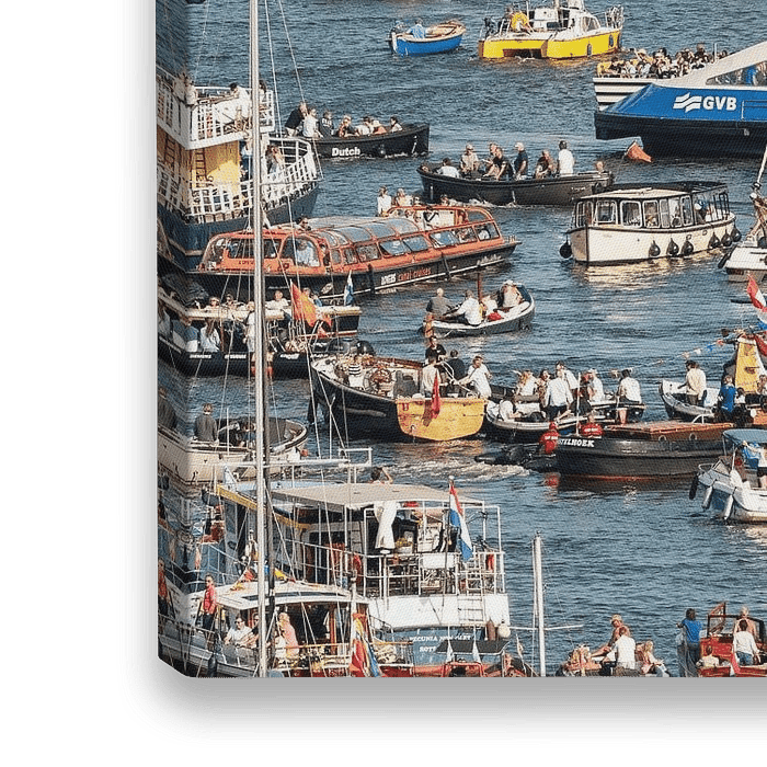 Deze bijzondere fotoprint van SAIL Amsterdam 2025 vangt de magie van dit wereldberoemde evenement: een zee van boten met de Amsterdamse GVB veerpont.