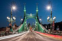 De Liberty Bridge in Boedapest, Hongarije. De brug werd oorspronkelijk gebouwd als onderdeel van de Millennium Wereldtentoonstelling aan het eind van de 19e eeuw. De brug heeft een art nouveau-ontwerp, mythologische beelden en het wapen van het land op de zijkant.