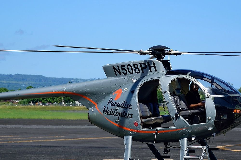 We gingen op een lava & rainforests adventure tour die vertrok vanaf het vliegveld in de stad Hilo op het Big Island in Hawai'i, VS. We kozen voor de optie om zonder deuren in de helikopter te vliegen omdat dat zeker beter zou zijn voor het bekijken en fotograferen. Toen we dit zagen, twijfelden we even. We gingen er toch voor.