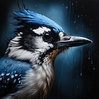 Gaai - Dit schilderij toont een close-up van een vogel, vermoedelijk een blauwe gaai, met een prachtige mengeling van levendige blauwe en subtiele bruine veren. Het kunstwerk combineert hyperrealistische details met een achtergrond die door vloeiende verfstreken en vallende waterdruppels een bijna abstracte sfeer…