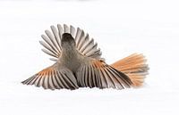 Twee Taiga-gaaien in gevecht. Deze foto is in de winter genomen in Finland.