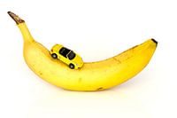 De gele auto maakt vaart in de bocht van de gele banaan.