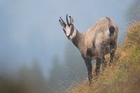 Chamois / Alpine chamois / Gaemse ( Rupicapra rupicapra ) watching back over its shoulder, stands at a steep slope in alpine vegetation, hazy weather, wildlife, Europe.