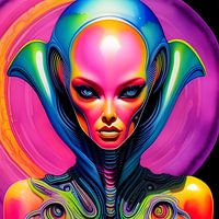 "Galactic Goddess" vangt de essentie van kosmische schoonheid in een betoverend aquarelkunstwerk. Het portret, gericht op het goddelijke gezicht van een buitenaardse vrouw, onthult een surrealistisch spel van kleuren en vloeibare vormen.