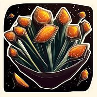 Deze prachtige digitale collectible heeft een surrealistische, buitenaardse plant met gloeiende amberkleurige knoppen die eruit zien alsof ze zijn gesmeed uit gesmolten sterrenstof. De gloeiende bloemblaadjes steken af tegen de donkere kosmische achtergrond en doen denken aan hemelse sintels die door de ruimte zweven.