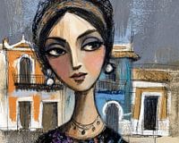 Galapagoseilanden schilderij - Op dit schilderij van de Galapagoseilanden zie je een vrouw met opvallende sieraden en een kleurrijke achtergrond van huizen, wat de lokale cultuur en stijl weerspiegelt.