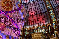 Het dak van Parijs warenhuis Galeries Lafayette in december. Links hangt de kerstboom op zijn kop.