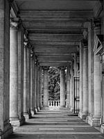 Sommige plekken voelen alsof ze hun adem inhouden. Deze galerij op de Capitolijnse Heuvel in Rome had precies dat stille, gespannen gevoel. De symmetrie trekt je naar binnen, zuil na zuil, en leidt je blik helemaal naar de bomen aan het einde. Maar het gaat niet alleen om de structuur—het is de manier waarop het zachte licht het steen…